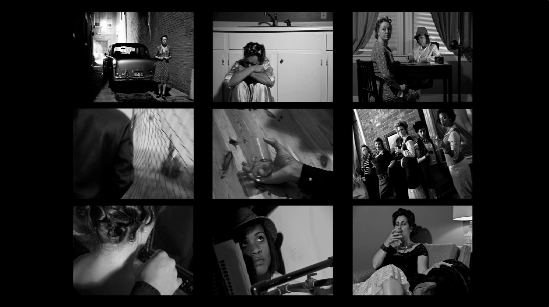 Nine Frame Noir (SCR/DIR Jennida Chase, USA, 2011, black and white. TRT 01:50) This stop-animation video screening version of Nine Frame Noir -- an experimental-narrative film noir thriller -- consists of nine segments within a single frame aligned in a grid, each depicting a tiny, looped gesture based on traditional film noir language. They collectively hint at a larger narrative, of which they are all pieces.